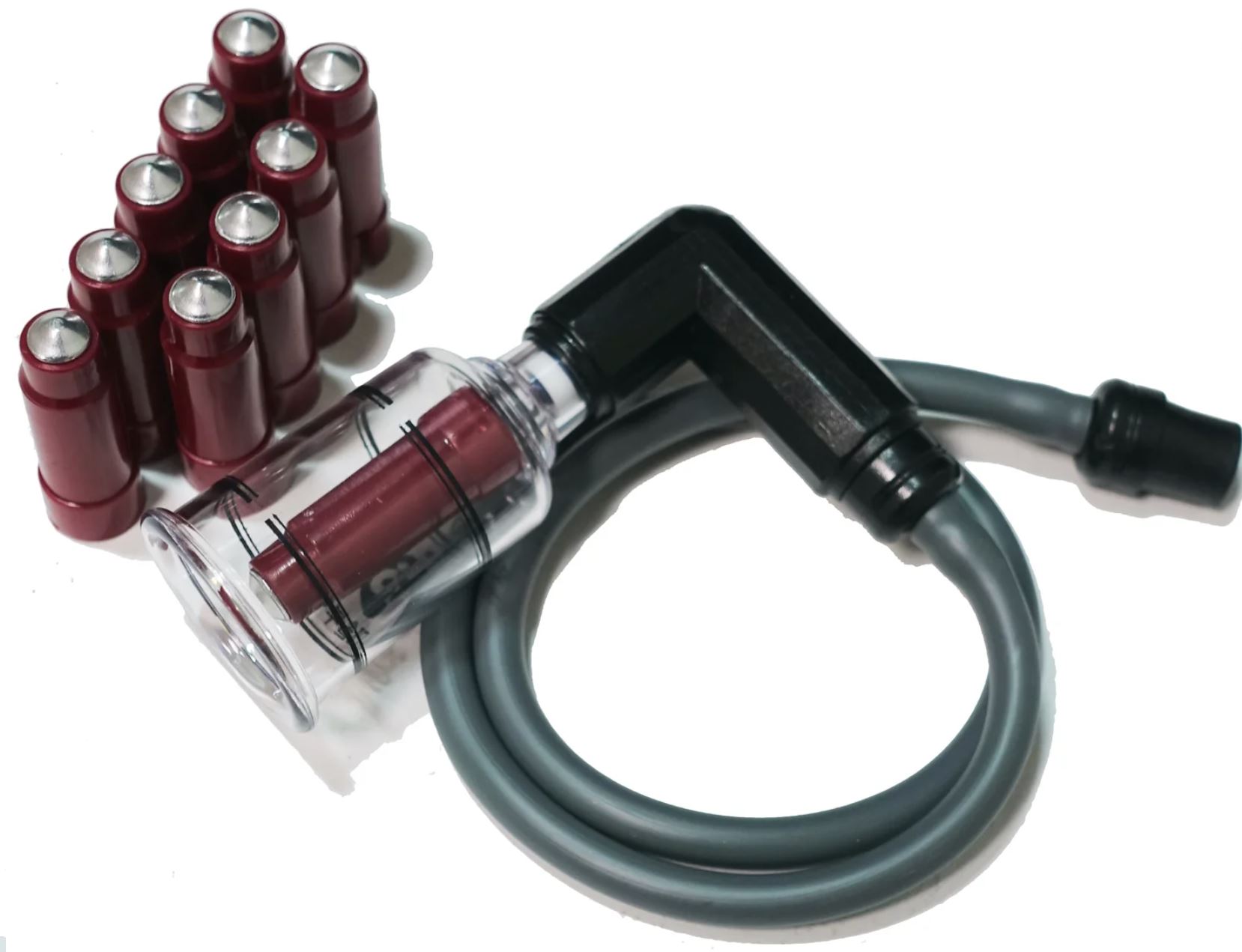 17 plastic cup set with pressure tips which also apply a mild acu-pressure to the body. Each set includes 10 red, 0.3” dia, 0.3” dia x 1.7” long, removable insert probes. These fit the 2” and 1.5” dia cups. Also includes pistol grip hand pump with carrying case. Set also includes 15 pcs of semi-disposable plastic cups inserts which fit the 2” dia cups.